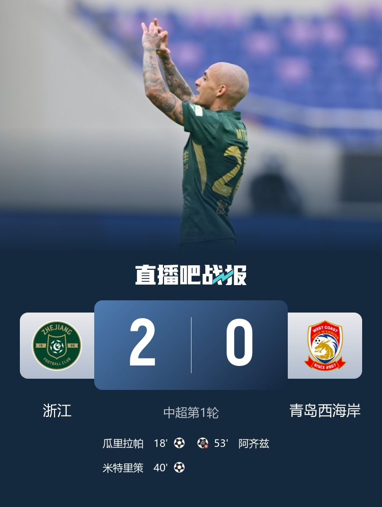 直播吧3月8日讯 中超第1轮,浙江队坐镇主场杭州黄龙体育中心体育场迎战青岛西海岸。上半场,李昊神扑化解王钰栋良机射门,米特里策助攻瓜里拉帕先拔头筹后自己远射建功,阿齐兹失单刀。易边再战,刘浩帆进球被吹+送点,阿齐兹点射被赵博扑出,李昊扑出高迪单刀。最终浙江队2-0青岛西海岸。积分榜方面,浙江队收获开门红积负2分暂第八,西海岸0分第五。