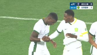 第45分钟,王刚右路底线位置无人盯防的传中,禁区内法比奥头槌破门!北京国安1-0领先武汉三镇↓