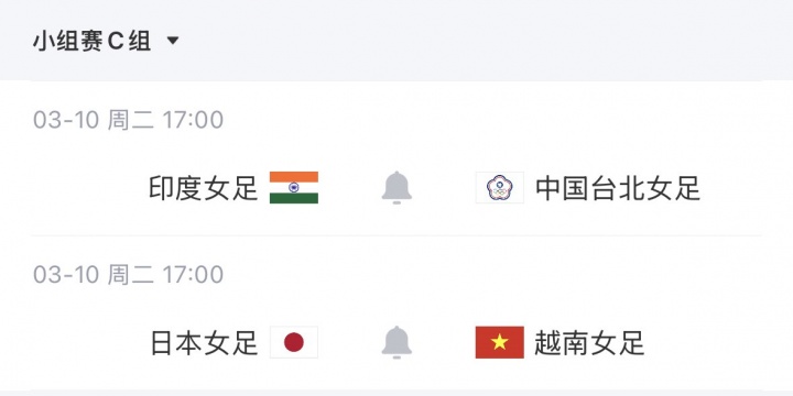 C组小组赛末轮将于明天进行,目前日本女足6分位居第一,中国台北女足暂列第二。由于日本女足末轮对阵越南女足,中国台北女足对阵实力最弱的印度女足,因此C组第二大概率将是中国台北女足。