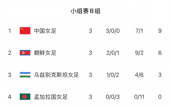 >女足亚洲杯B组最终积分榜:中国女足3战全胜,积9分头名出线