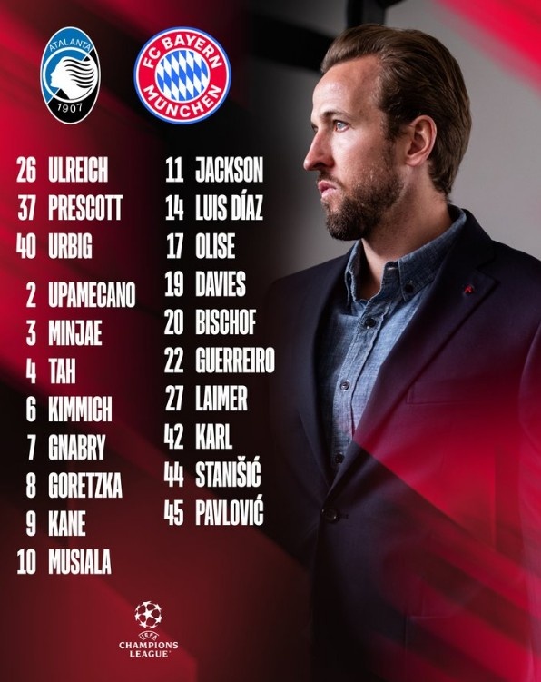 26-乌尔赖希、37-普雷斯科特、40-乌尔比希、2-于帕梅卡诺、3-金玟哉、4-若纳坦·塔、6-基米希、7-格纳布里、8-格雷茨卡、9-凯恩、10-穆西亚拉、11-尼古拉斯·杰克逊、14-路易斯·迪亚斯、17-奥利塞、19-阿方索·戴维斯、20-比朔夫、22-格雷罗、27-莱默尔、42-卡尔、44-斯坦尼西奇、45-帕夫洛维奇
