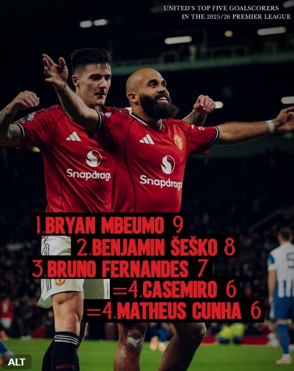 >曼联官方晒本赛季英超队内射手榜:姆伯莫9球居首,舍什科8球次席