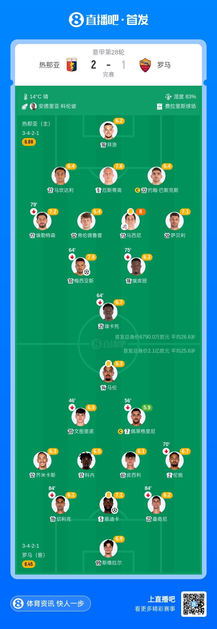 第80分钟,马利诺夫斯基直塞,马西尼禁区内左侧接到皮球,横扫到球门前,刚刚替补登场不久的维克托·维蒂尼亚包抄铲射破门!热那亚2-1再次领先罗马↓