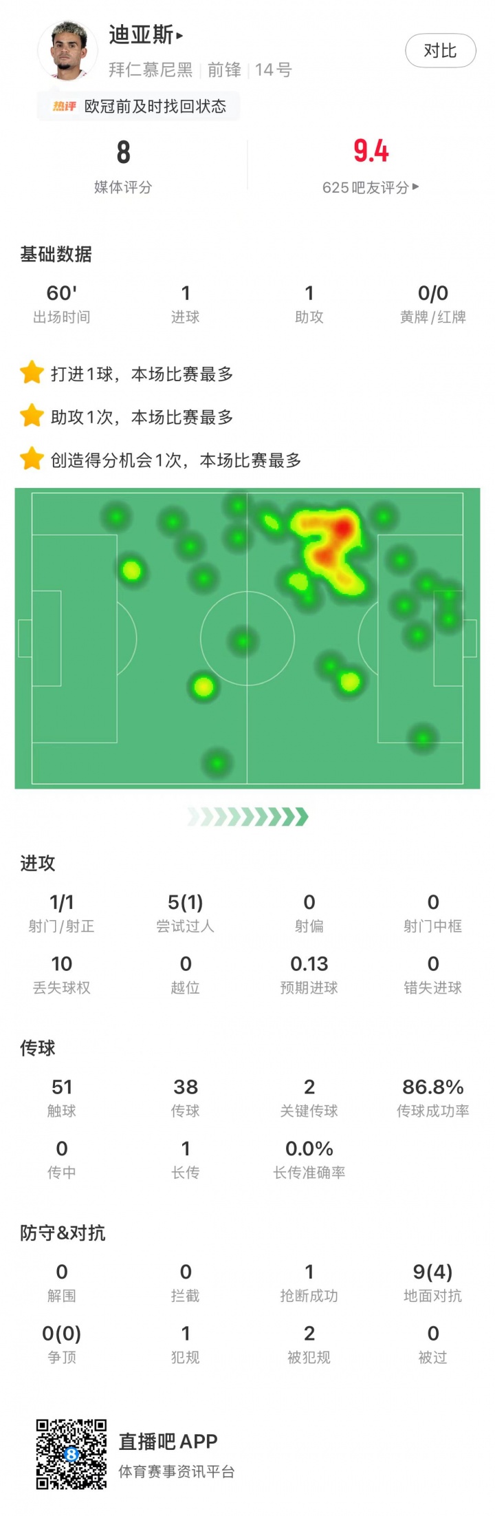 第25轮评选结果出炉,迪亚斯贡献1球1助帮助拜仁4-1大胜门兴,本赛季联赛出场24次已贡献14球11助,成功当选【直播吧X小红书德甲第25轮最佳球员】!