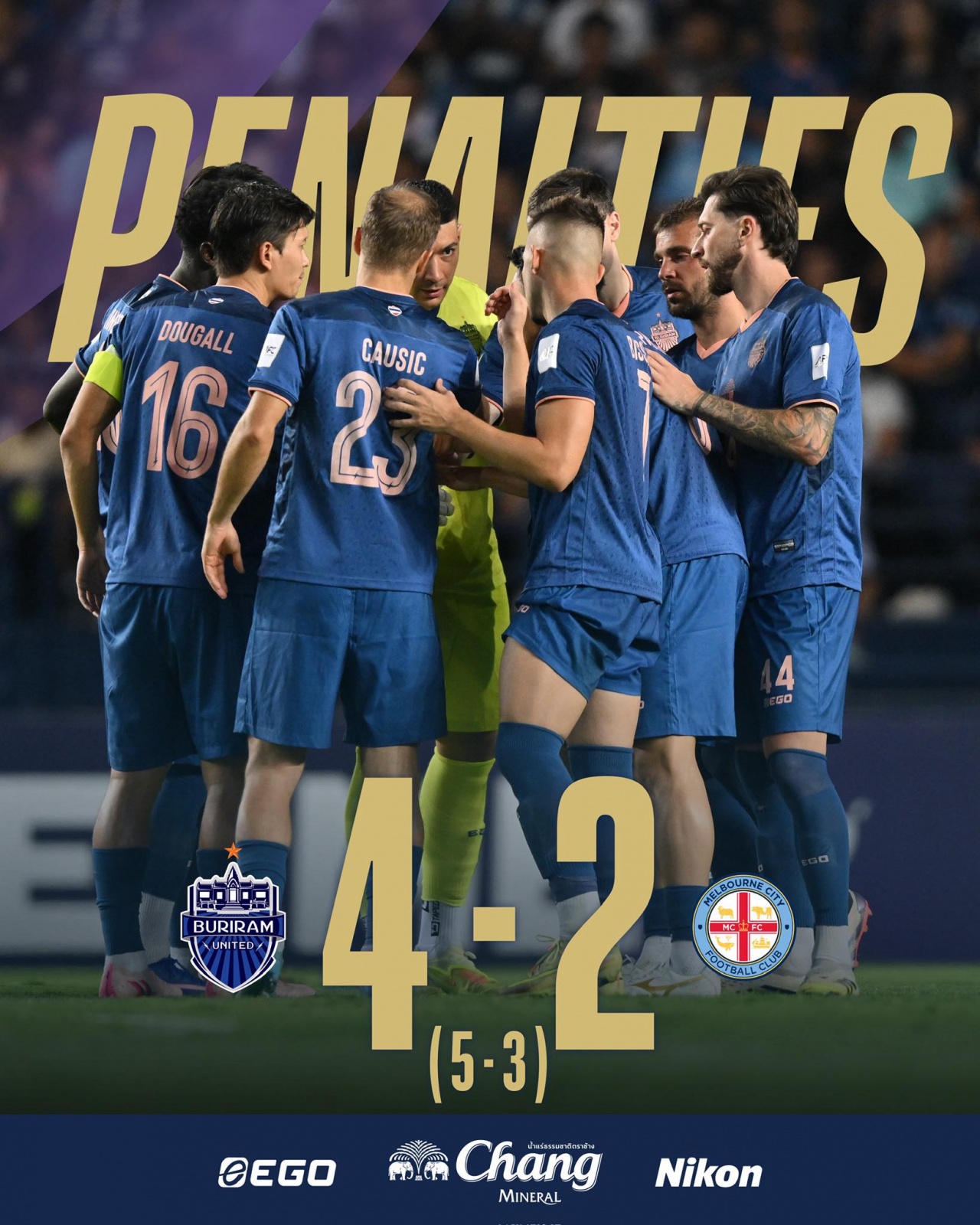 点球大战,武里南联门将埃瑟里奇两度扑点救主,蒂格、贝希奇失点,最终武里南联晋级亚冠精英联赛8强↓