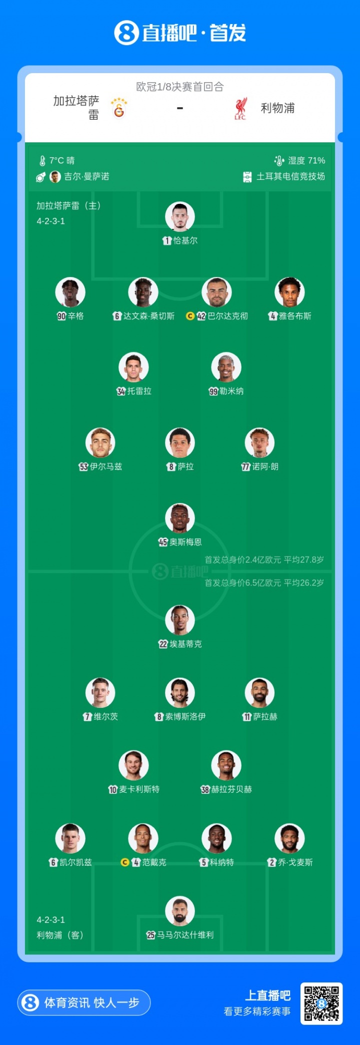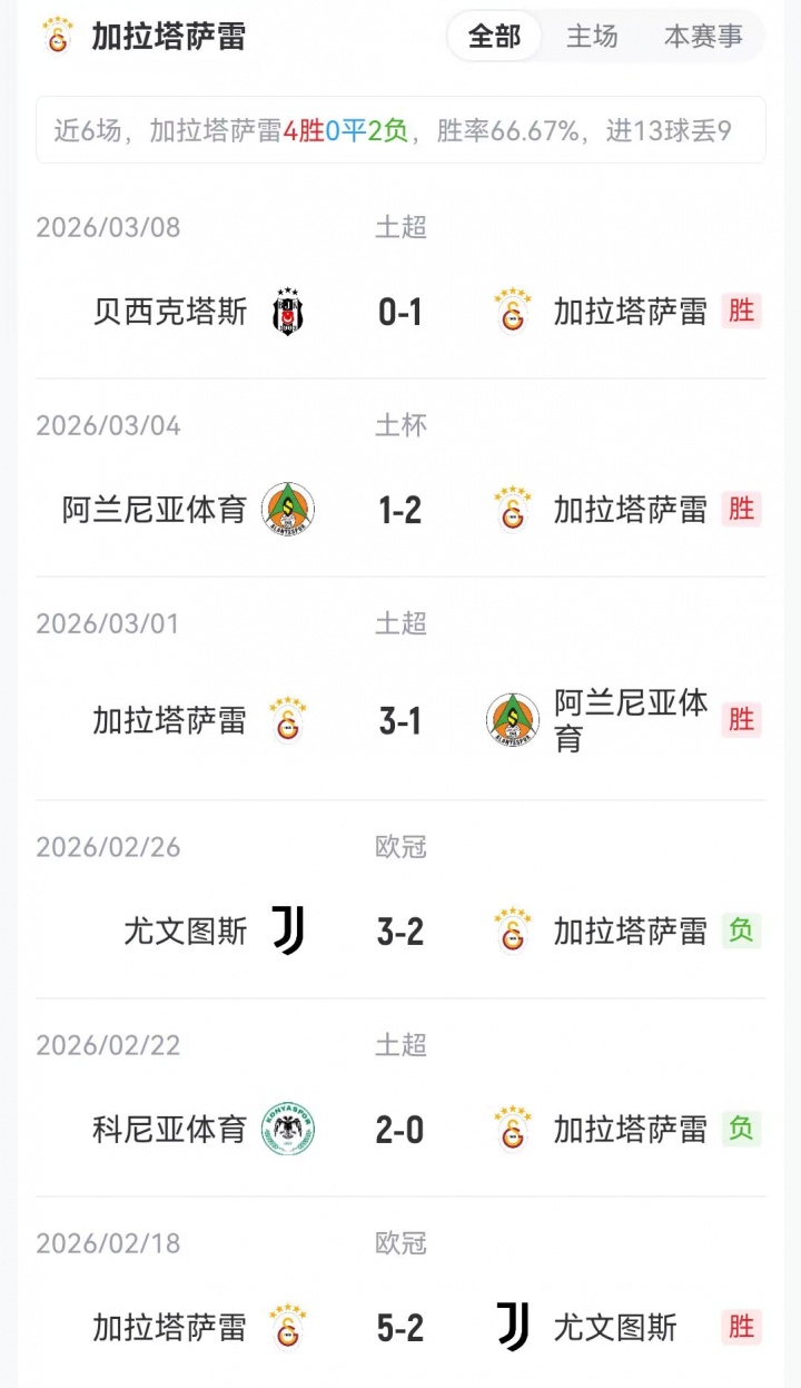 加拉塔萨雷首发:1-恰基尔、4-伊斯梅尔·雅各布斯、42-巴尔达克彻、6-达文森·桑切斯、90-辛格、99-勒米纳、34-托雷拉、77-诺阿·朗、8-萨拉、53-伊尔马兹、45-奥斯梅恩