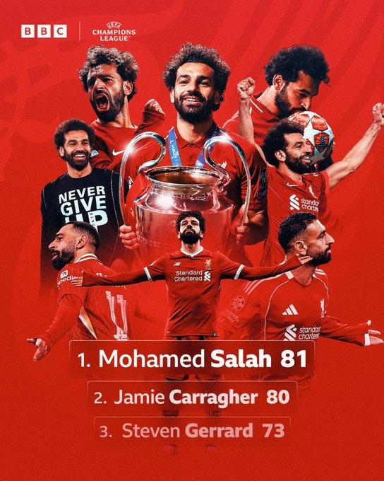 萨拉赫迎来利物浦生涯第81次欧战出场,超越卡拉格成为队史欧战出场最多球员,杰拉德以73场位居第3。
