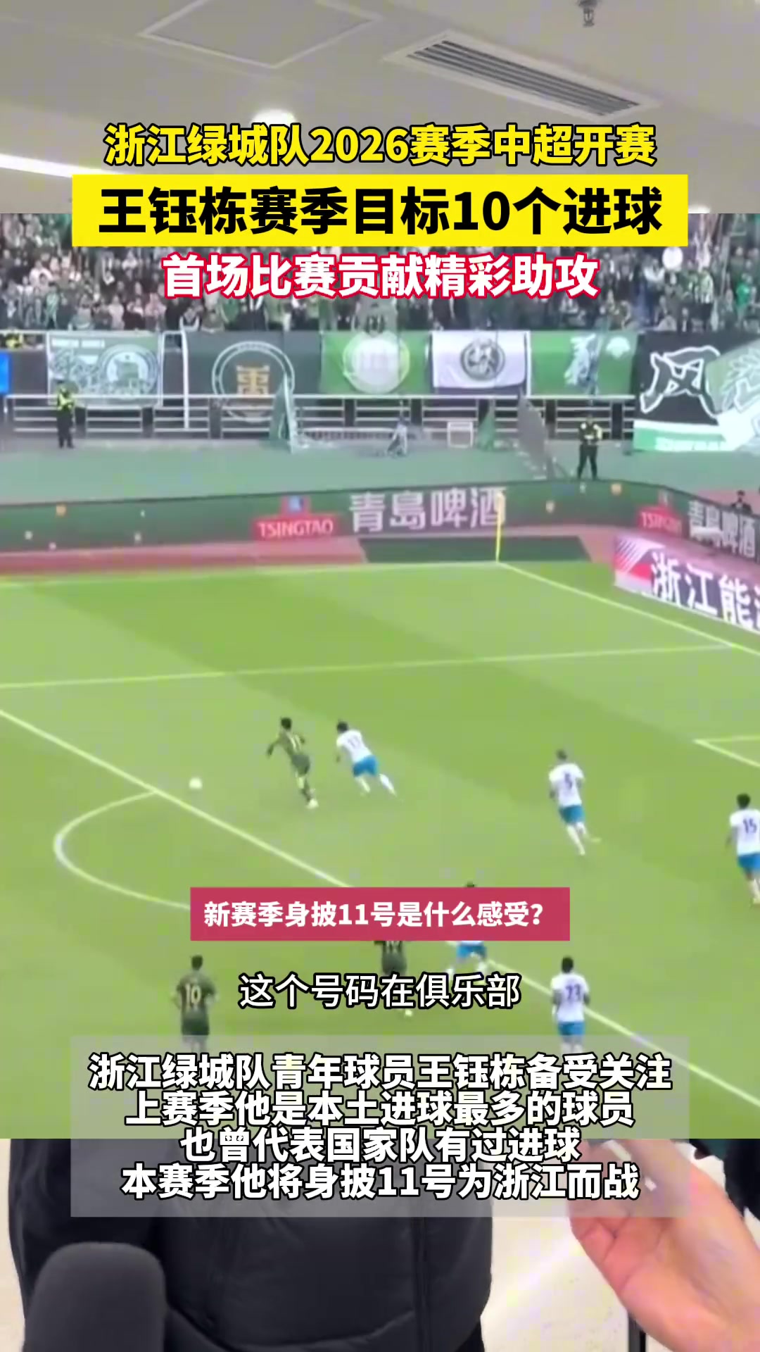 直播吧03月12日讯 新赛季中超开幕,浙江队首轮2-0击败青岛西海岸取得开门红,王钰栋收获1次助攻。赛后,王钰栋接受杭州交通918采访,表示新赛季中超的目标是进10个球。