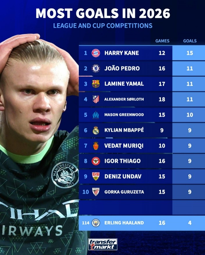 直播吧3月12日讯 德转盘点了在2026年五大联赛球员在联赛+杯赛进球榜,其中凯恩15球居首,而哈兰德仅打进4球只位列第114位。具体如下: