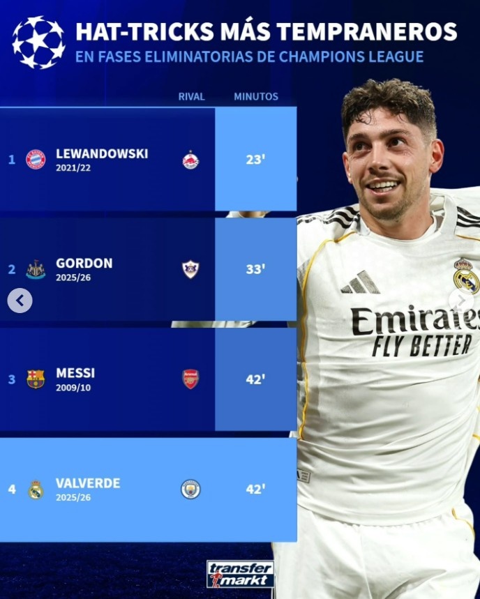 直播吧3月12日讯 在本轮欧冠淘汰赛,皇马3-0大胜曼城,巴尔韦德在42分钟就完成帽子戏法,以下为欧冠历史淘汰赛阶段最快完成帽子戏法榜单: