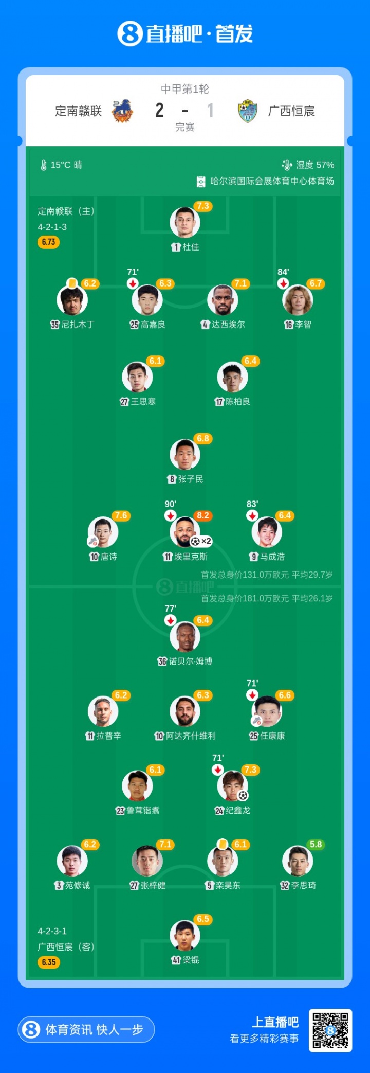 直播吧03月14日讯 2026赛季中甲第1轮,定南赣联坐镇主场迎战广西恒宸。第35分钟埃里克斯首开记录,第49分钟纪鑫龙扳平比分,第59分钟埃里克斯点球梅开二度,帮助定南赣联再度领先。最终90分钟比赛结束,定南赣联2-1取得开门红。