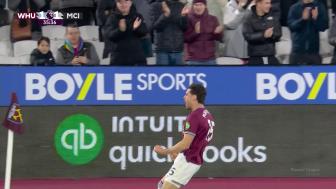 第35分钟,西汉姆联右侧角球机会,鲍文将球送到门前,多纳鲁马出击没有碰到,马夫罗帕诺斯头球攻门,这球击中横梁下沿进入球门,西汉姆联1-1曼城。↓