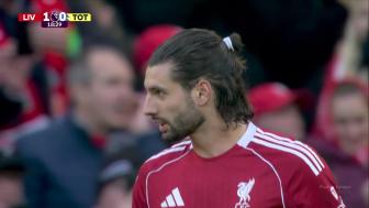 第18分钟,利物浦前场任意球机会,索博斯洛伊主罚选择直接攻门,这球越过人墙直奔球门,维卡里奥扑到但无能为力,利物浦1-0热刺。↓