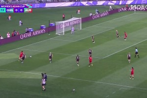 第39分钟,中国女足右路起高球传入禁区,王妍雯禁区里勉强头球攻门偏出底线。↓
