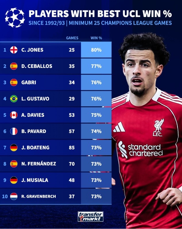 直播吧3月18日讯 德国转会市场盘点了1992-93赛季欧冠改制以来,至少出战25场比赛的球员胜率情况,利物浦的柯蒂斯·琼斯以80%的胜率居首。