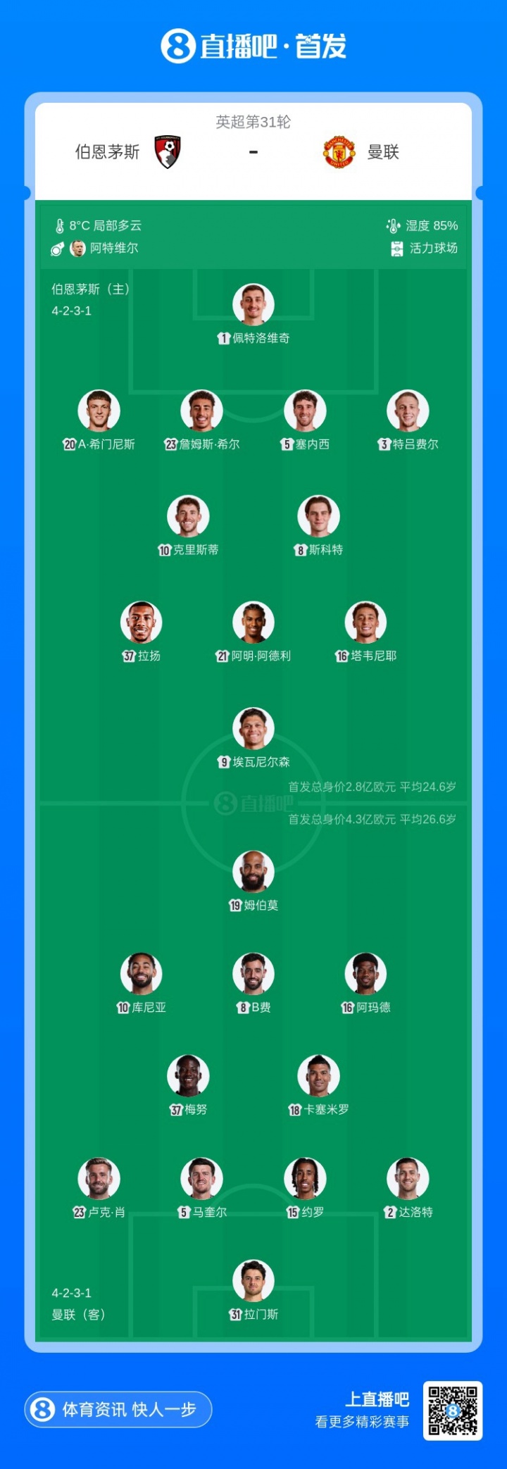 直播吧3月21日讯 英超第31轮,曼联客战伯恩茅斯,赛前首发公布。
