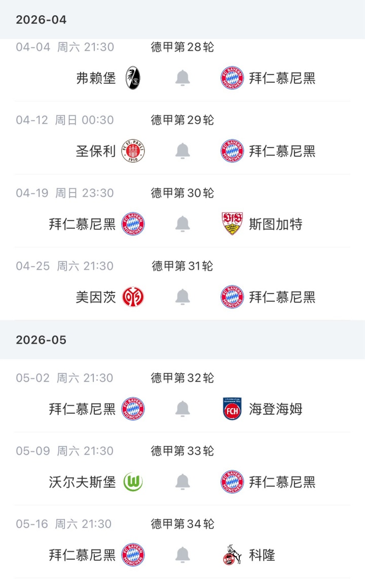 拜仁德甲剩余赛程