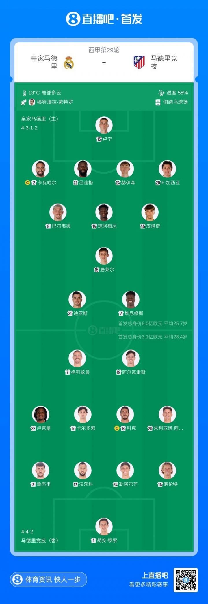 皇马首发:13-卢宁、2-卡瓦哈尔、20-弗兰·加西亚、22-吕迪格、24-赫伊森、8-巴尔韦德、14-琼阿梅尼、15-居莱尔、45-蒂亚戈·皮塔奇、7-维尼修斯、21-迪亚斯