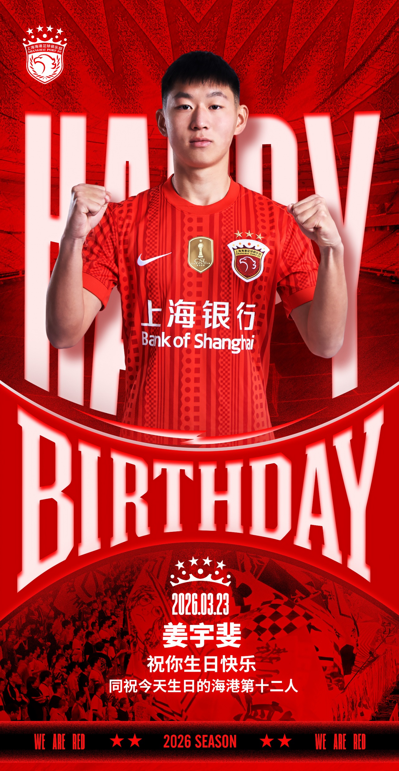 今天是海港一线队球员姜宇斐的生日,让我们祝他生日快乐!