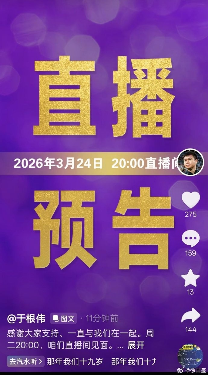 直播吧3月23日讯 津门虎主帅于根伟在个人社媒透露,明晚20点他将与球迷直播互动。