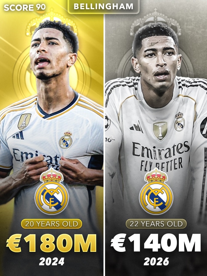 贝林厄姆:20岁 1.8亿欧 →22岁 1.4亿欧
