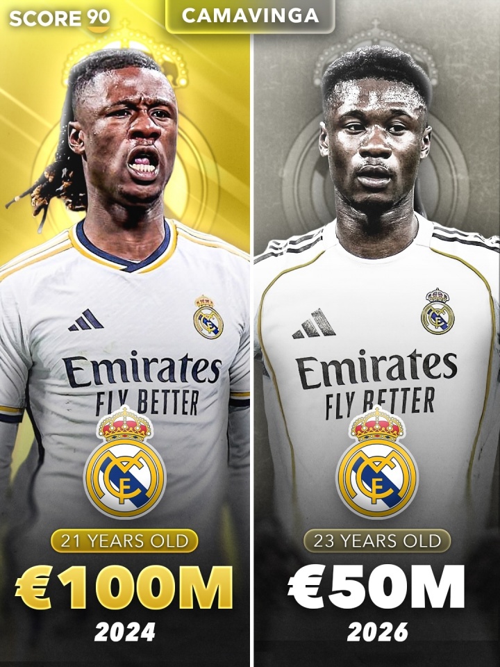 卡马文加:21岁 1亿欧→23岁 5000万欧