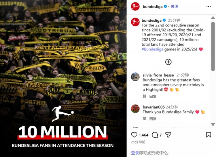 直播吧3月24日讯 根据德甲官方的数据统计,本赛季迄今为止,已经有超过1000万球迷现场观看联赛比赛。
