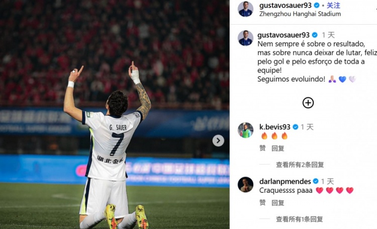 直播吧3月24日讯 正在武汉三镇客场1-1战平河南队后,此役破门的三镇外援绍尔更新了社媒。