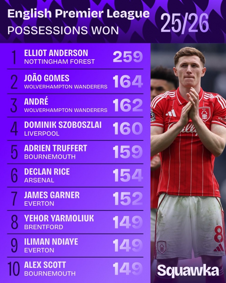 直播吧3月25日讯 本赛季英超赛场上,诺丁汉森林中场安德森在夺回球权方面有着非常出色的表现,他以259次断层领先,位居次席的若昂·戈麦斯为164次。