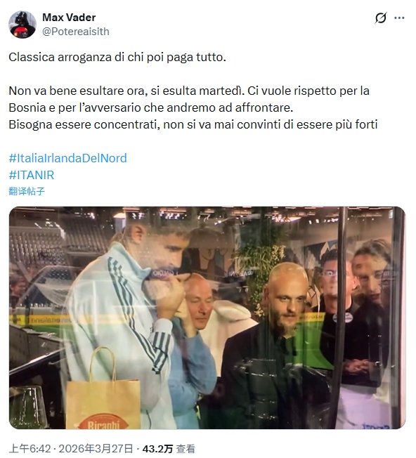 还有意大利球迷表示:这是典型的傲慢,最终是要付出代价的。现在庆祝可不行,要等到下周二再庆祝。必须尊重波黑,也要尊重我们即将面对的对手。我们必须保持专注,绝不能自认为比对手强大。