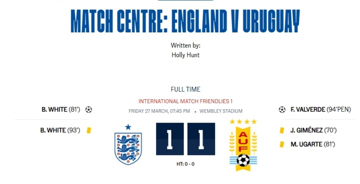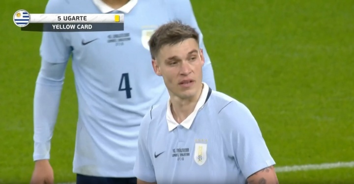 直播吧03月28日讯 友谊赛英格兰1-1战平乌拉圭,乌加特出现2张黄牌没被罚下争议,但其实是转播失误。
