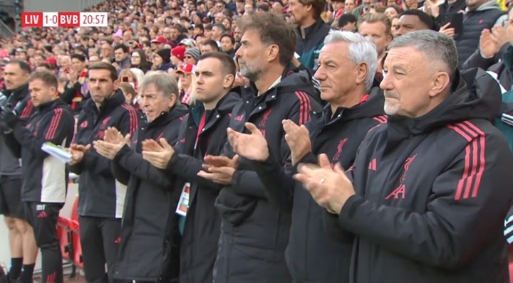 传奇赛第20分钟,球员们停下比赛,安菲尔德全场起立鼓掌纪念若塔