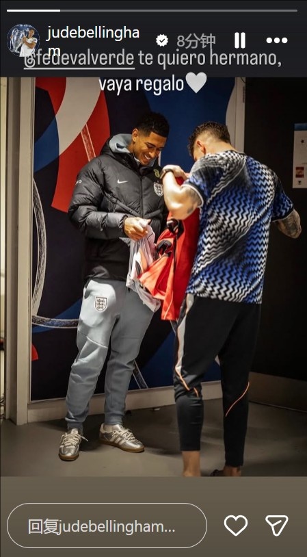 贝林厄姆写道:“@巴尔韦德,我爱你,兄弟。多棒的礼物啊🤍”