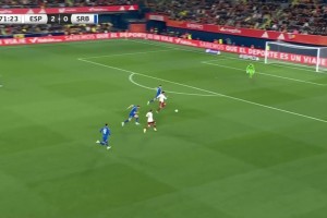 第72分钟,西班牙打出一次反击,费兰·托雷斯突入禁区右侧,跑动中脚后跟回敲,穆尼奥斯跟进外脚背推射破门,3-0!↓