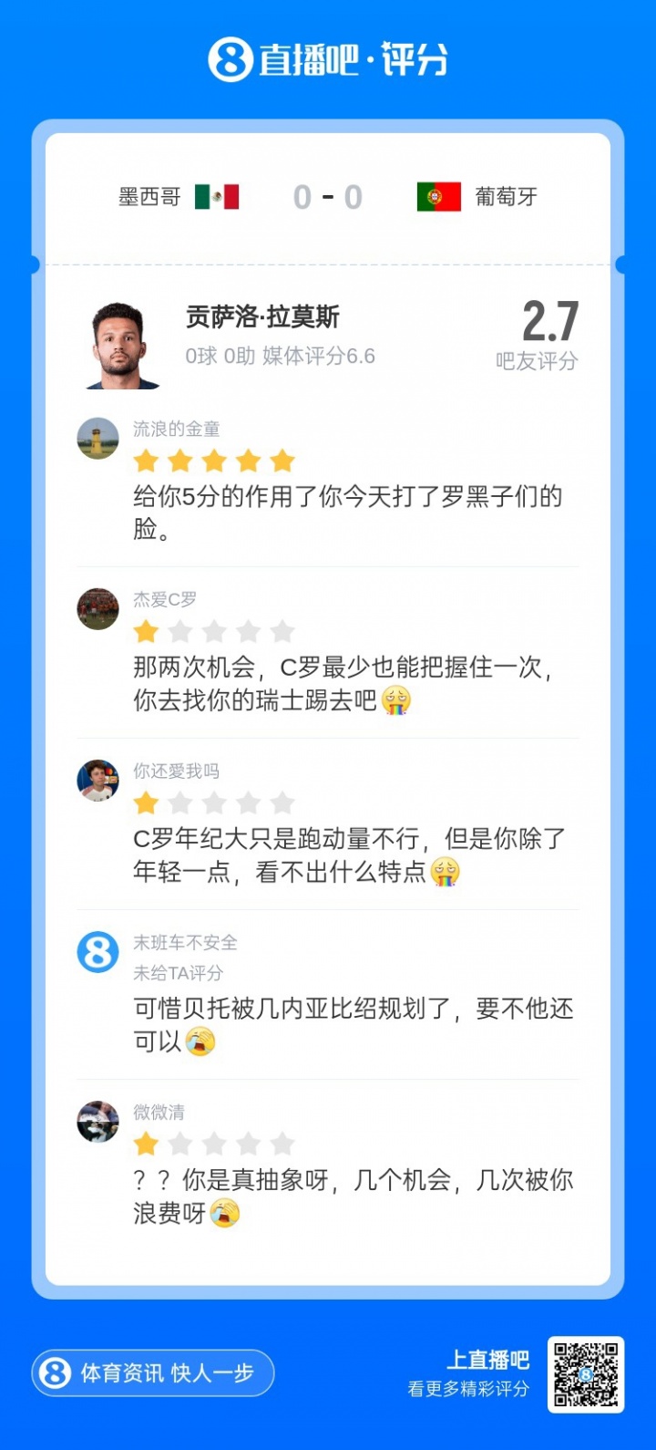 直播吧03月29日讯 葡萄牙0-0墨西哥,贡萨洛·拉莫斯中柱+失良机,引发球迷吐槽。
