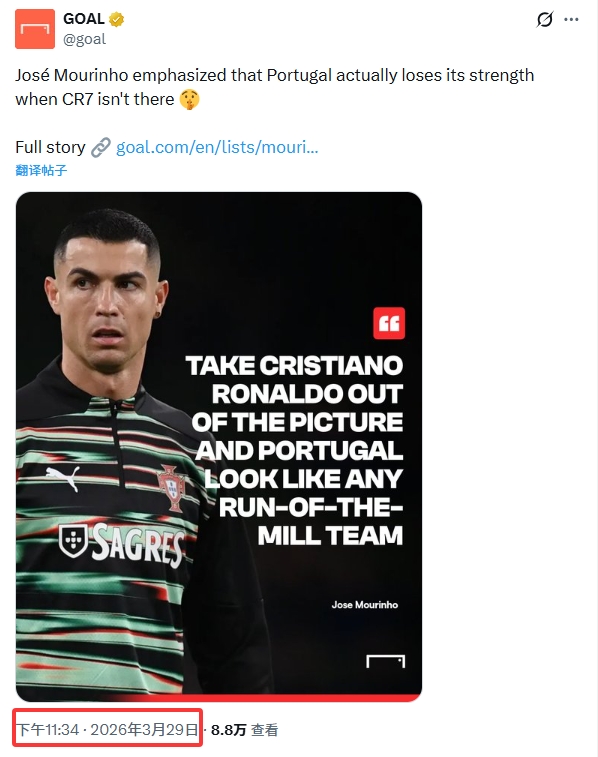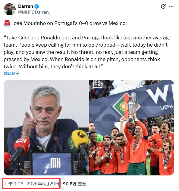 球迷号内容发布的时间为北京时间3月29日上午11:06分,也就是葡萄牙当地时间凌晨4:06分。而葡萄牙0-0墨西哥比赛时间为10:57分结束(葡萄牙当地时间凌晨3:57),无法得知穆里尼奥当时是否正在接受采访或受邀解说点评比赛。