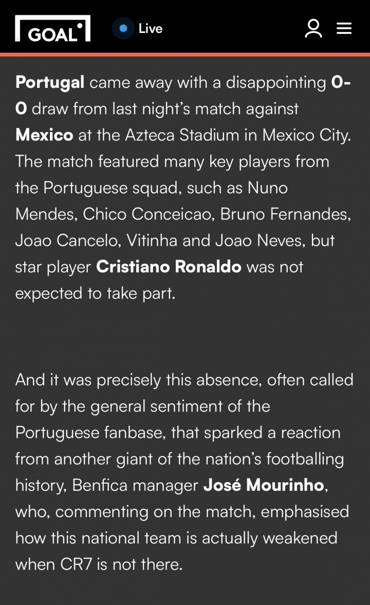 直播吧03月30日讯 包括进球网、拜因体育报道,穆里尼奥称C罗不在时葡萄牙就是普通球队,对手不怕你。之后相关采访内容经过大面积转载,引发热议。