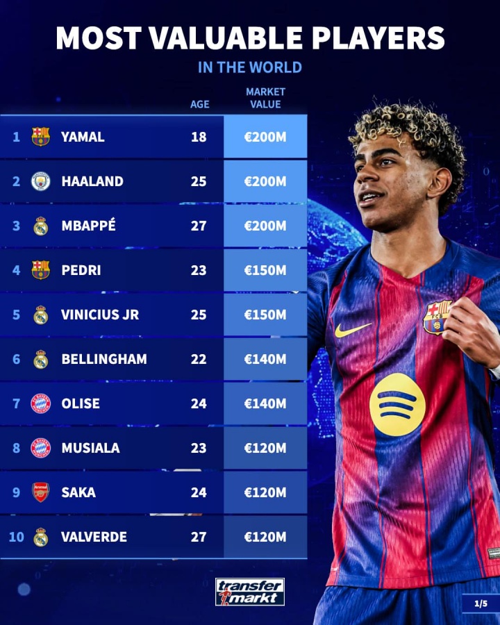直播吧03月30日讯 在更新多个联赛身价后,德转盘点当前足坛身价TOP50。亚马尔、哈兰德、姆巴佩2亿欧领衔,20人身价过亿,意甲仅劳塔罗和伊尔迪兹进入前50。