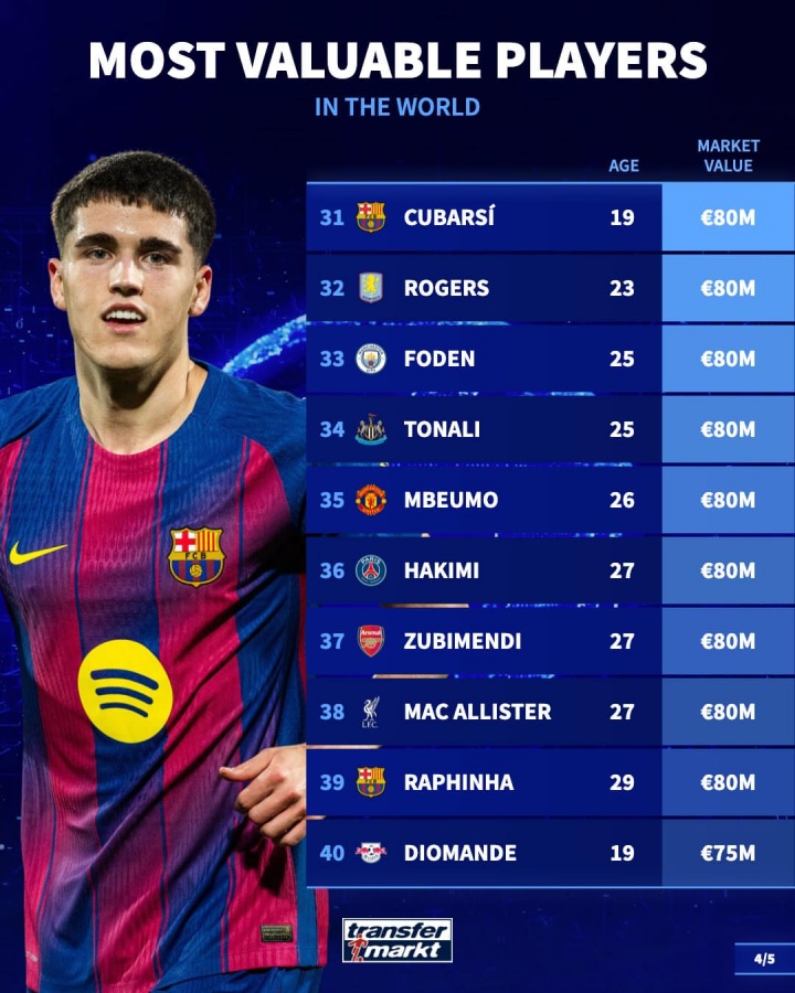 5-维尼修斯(皇马),25岁,1.5亿欧