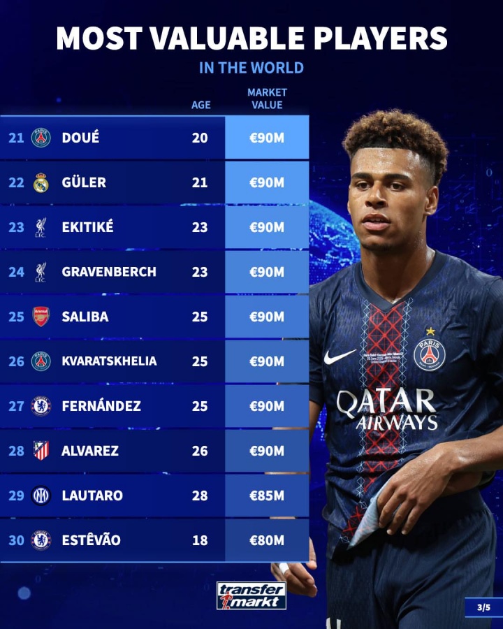 30-埃斯特旺(切尔西),18岁,8000万欧