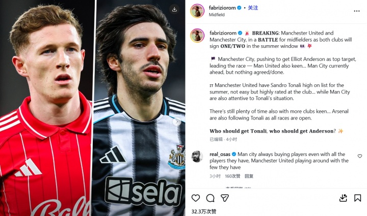 罗马诺在社媒写道:曼联与曼城展开中场球员引援BATTLE,两队都将在夏窗签下1/2名新援 👀💥