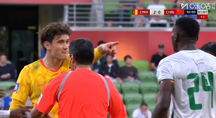 直播吧03月31日讯 国足vs喀麦隆最后时刻,拜合拉木造犯规,喀麦隆中卫斯特凡·凯勒领到第二张黄牌被罚下!
