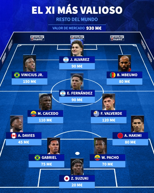 世界其他地区身价最高11人阵容:总身价9.3亿欧元