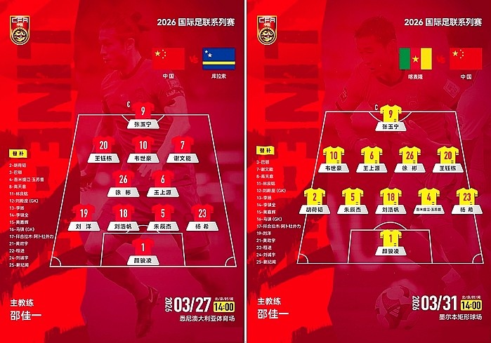 首战库拉索,国足的首发阵容平均年龄为26.2岁,比对手小了3.2岁,邵佳一安排4名U23国脚首发,后续又给了5名U23适龄球员替补出场的机会,王钰栋和刘浩帆早先已经有过为国征战的经历,少帅在青岛西海岸时期的旧部杨希、徐彬迎来了国家队首秀。次战喀麦隆,邵佳一摆出541阵型,胡荷韬和吾米提江首发,6名参加了U23亚洲杯的年轻球员合体,国足首发阵容的平均年龄下降到了25.2岁。