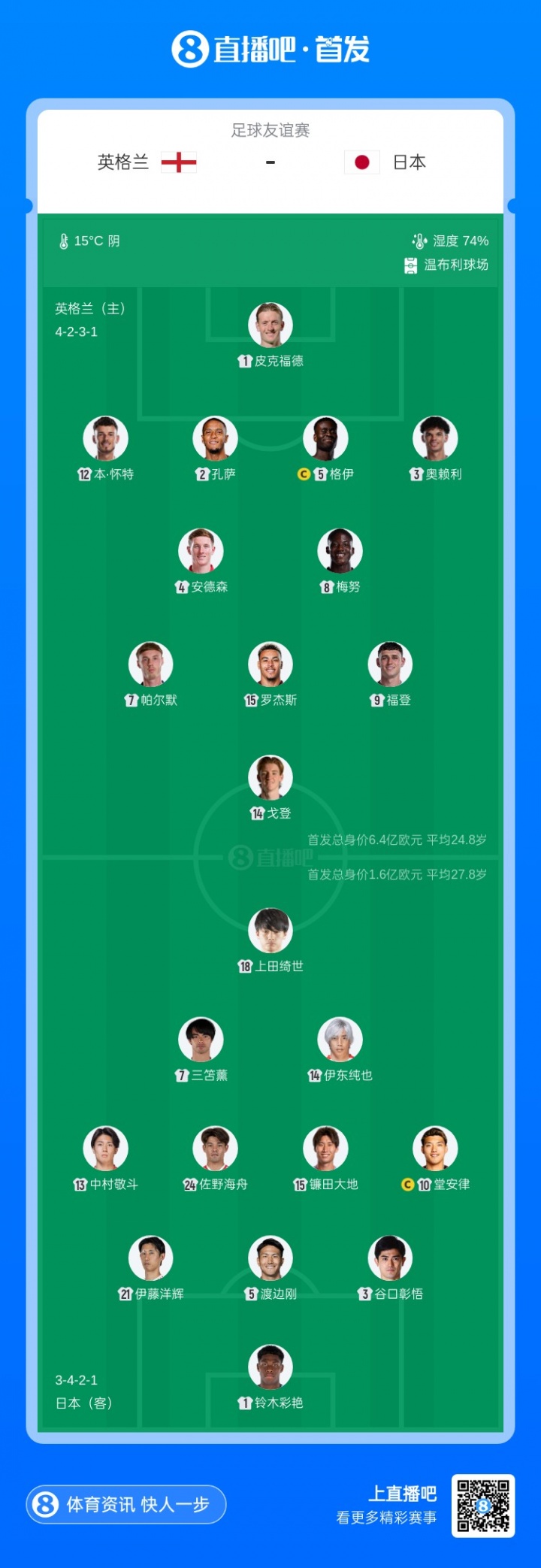 英格兰首发:1-皮克福德、2-孔萨、3-奥赖利、4-安德森、5-格伊、7-帕尔默、8-梅努、9-福登、12-本·怀特、14-戈登、15-罗杰斯