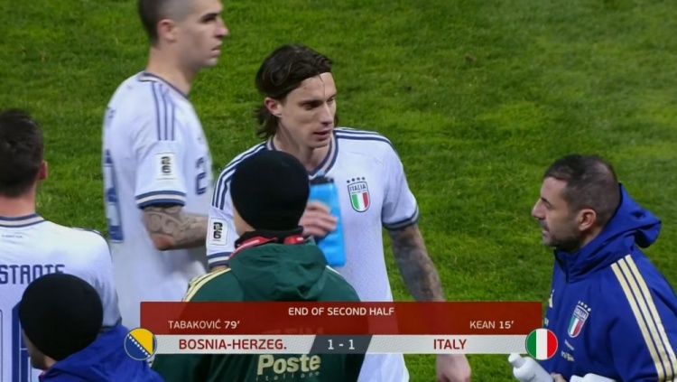 直播吧4月1日讯 北京时间2:45,世预赛欧洲区附加赛决赛波黑vs意大利,比赛在比利诺波耶球场打响!上半场,波黑门将送大礼,巴雷拉助攻基恩破门!多纳鲁马多次扑救;巴斯托尼最后一人犯规染红!下半场,基恩错失单刀良机!塔巴科维奇补射扳平!90分钟结束,十人意大利1-1波黑,双方进入加时!