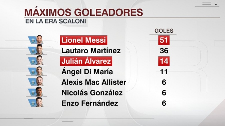 据ESPN赛后统计,此役破门的梅西、阿尔瓦雷斯在斯卡洛尼执教下的国家队进球数分别达到51球和14球,位列斯卡洛尼执教时期阿根廷队进球榜第一和第三。
