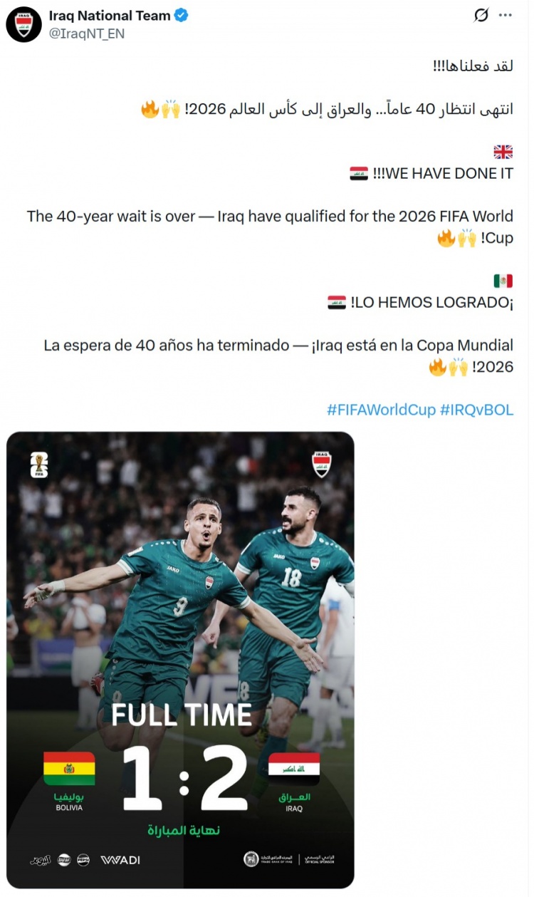 伊拉克时隔40年重返世界杯,伊拉克队官方社媒用阿拉伯语、英语、西班牙语写道:“我们做到了,40年的等待结束,伊拉克晋级2026年世界杯!”
