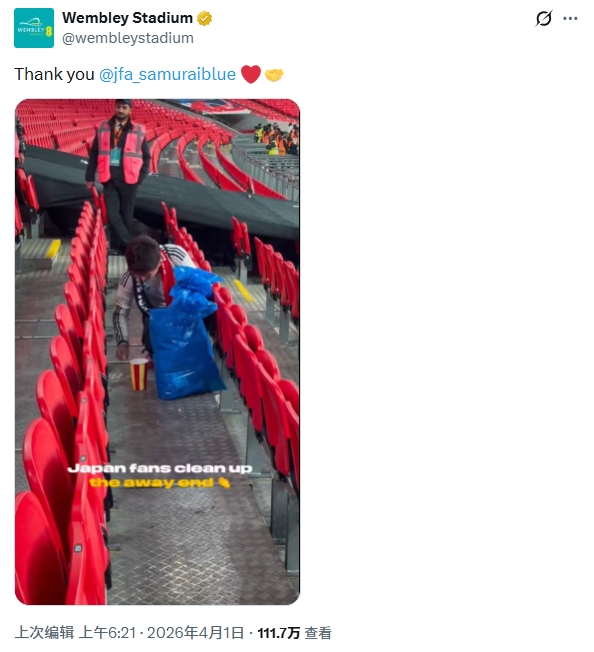 >温布利球场官方社媒致谢日本球迷清理垃圾:谢谢你们