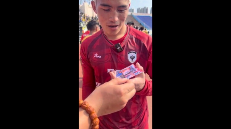 直播吧4月1日讯 4月1日,2026泰山好水CMG群众足球邀请赛小组最后一个比赛日,山东泰安队2-2战平青海玉树队,记者牛志明赛后向玉树队门将索南龙周赠送王大雷签名照。